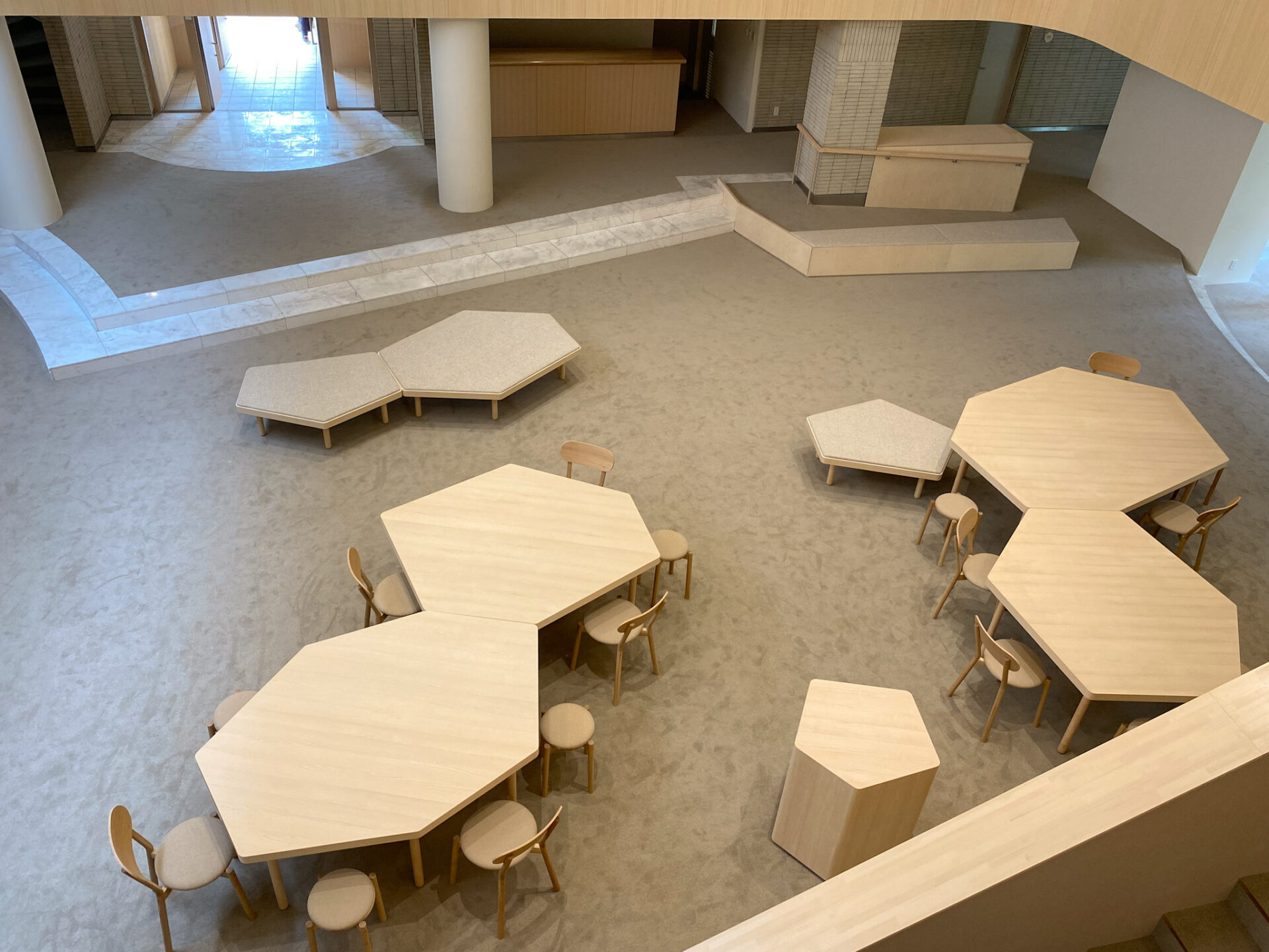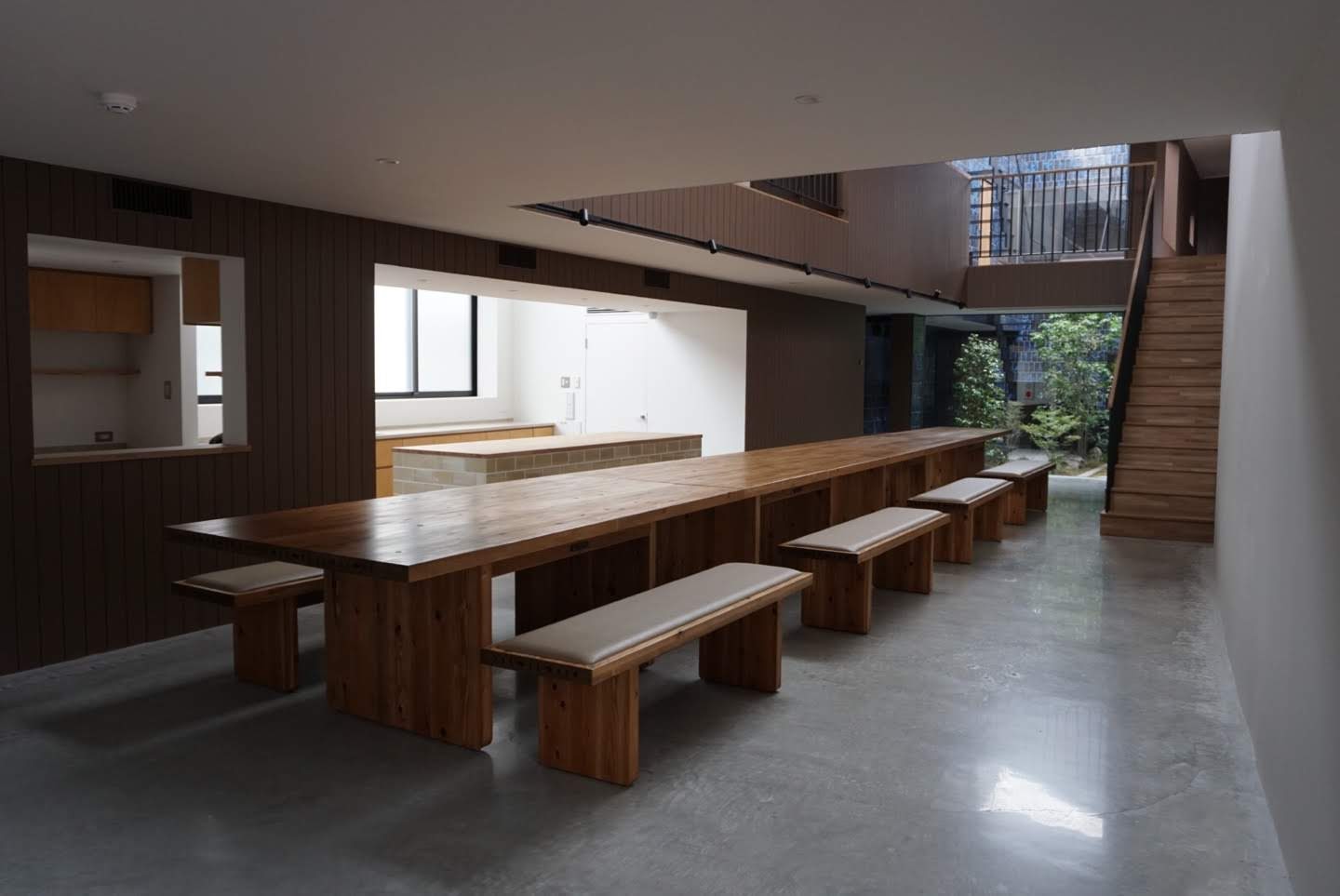 titleOTSUKA GROUP TRANING CENTERdate2023design大西麻貴+百田有希 / o+hcontentsラウンジ、食堂のテーブル、ベンチ、収納、キッチン等の製作設置detail >> linkX -